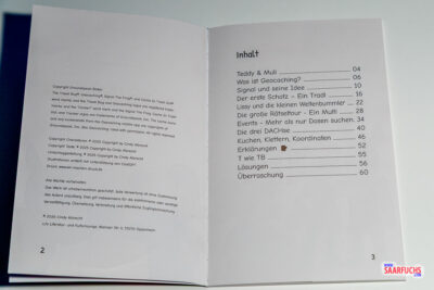 Der dezente Hinweis „Band 1, Buch 1“ weckt bereits die Vorfreude darauf, dass Teddy und Muli in Zukunft noch weitere Abenteuer erleben werden. Das übersichtliche Inhaltsverzeichnis listet neun Kurzgeschichten auf, mit denen die Autorin Cindy jungen Lesern die Welt des Geocachings spielerisch näherbringt. Ergänzt wird das Buch durch einen praktischen Anhang: Ein Glossar erklärt die wichtigsten Fachbegriffe, während ein individueller TB-Code, die Lösungen zu den Rätseln und ein Ausmalbild den interaktiven Charakter des Buches unterstreichen.