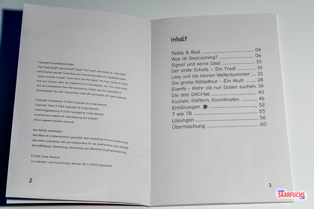 Die Idee ein Kinderbuch zu schreiben kam im Februar 2025 von Muli, der gelernter Kinderpfleger ist. Wir waren mit Freunden im Schnee cachen und da kam das Gespräch auf, dass es einfach zu wenige Nachwuchs-Cacher gibt. Daraus entwickelte er die Idee, dass ich mit unseren Erlebnissen und meiner Kreativität doch sehr gut ein Kinderbuch schreiben könne. Anfangs konnte ich nicht wirklich viel mit dem Thema anfangen und sie ruhte erstmal im Hinterkopf. Als ich dann für unser Auto einen TB-Magneten erstellen wollte und dafür „Teddy & Muli“ erschaffen hatte, dachte ich mir „Die Beiden wären eigentlich super für ein Kinderbuch“. Von da an packte auch mich die Neugier und ich arbeitete mich in das Thema Kinderbuch schreiben ein, was mir tatsächlich sehr viel Spaß machte und mich motiviert hat dran zu bleiben. Da ich ja nun aber nicht aus dem Fach bin und mir auch nicht sicher war, ob ich Zielgruppen gerecht schreibe und erstelle, habe ich mir Feedback von Grundschullehrern, Kinderpflegern und Betreuern geholt und den Stil angepasst. Getestet wurde das Ganze dann an meinem 4-jährigen Cousin, der am Ende direkt mit seinen Eltern campen gehen wollte – ein besseres Feedback konnte es nicht geben. Im Oktober war ich dann fertig mit dem Erstellen der Geschichten und Illustrationen, von da an ging es dann mit dem Zettelkram los: Lizenzen, Buchumschreiben, neuen Charakter einbinden (weil Signal nicht sprechen darf), Impressumsservice, Impressumsangaben, Probleme bei der Druckerei und und und – So verlegte ich den Verkaufsstart also von vor Weihnachten in das neue Jahr und konnte dann 21.03. endlich die Release-Party feiern :)