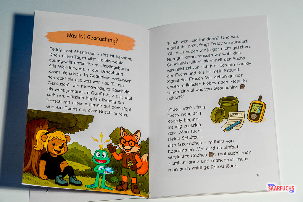 Die Geschichte beginnt mit der Bärin Teddy, die sich nach Abwechslung auf ihren bereits bekannten Wanderwegen sehnt. Mitten in ihrer Langeweile macht sie eine ungewöhnliche Entdeckung im Gebüsch und trifft dort auf den Fuchs Koordy sowie den Frosch Signal, der durch eine auffällige Antenne auf dem Kopf auffällt. Die beiden neuen Bekannten weihen die neugierige Bärin in ihr liebstes Hobby ein und erklären ihr die Grundlagen des Geocachings. Teddy erfährt, dass es sich dabei um eine moderne Schatzsuche handelt, bei der man mithilfe von Koordinaten kleine Verstecke aufspürt. Dabei reicht die Bandbreite von einfach versteckten Dosen bis hin zu komplexen Herausforderungen, bei denen man erst knifflige Rätsel lösen muss, um ans Ziel zu gelangen. Dieser Moment bildet den Startschuss für Teddys neues Abenteuer, bei dem ihr Forschergeist geweckt wird.