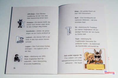 Den Kurzgeschichten folgen knapp vier Seiten mit Erklärungen zu typischen Geocaching-Begriffen. Zum Abschluss dieses Abschnitts darf sich der Leser einen individuellen Tracking-Code freirubbeln.